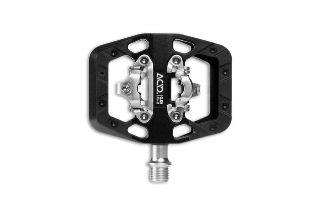 Das ACID Pedale CLICK A16-IB MTB überzeugt durch einen Aluminiumkörper. Mit einem beidseitigen SPD-kompatiblen Klick-Mechanismus ermöglicht es eine schnelles Ein- und Ausklicken. Zudem bietet die große Standfläche zusätzliche Halt. Mit einem Industrielager und einem Gleitlager pro Pedal sowie einer robusten CroMo-Achse überzeugt es durch Langlebigkeit und geringes Gewicht.