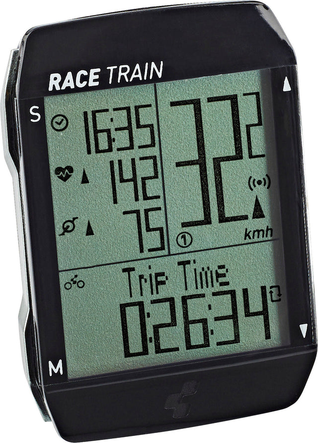 Cube's RACE TRAIN bietet 34 Funktionen, darunter Herz- und Trittfrequenzfunktionen. Alles ist mit den Fingerspitzen abrufbar. Dabei ist der Wechsel zwischen zwei Bikes leicht möglich und dank Auto Start/Stop-Funktion hast du alles unter Kontrolle. Selbst bei Nacht ist dieser Computer durch seine Beleuchtung noch einsetzbar.